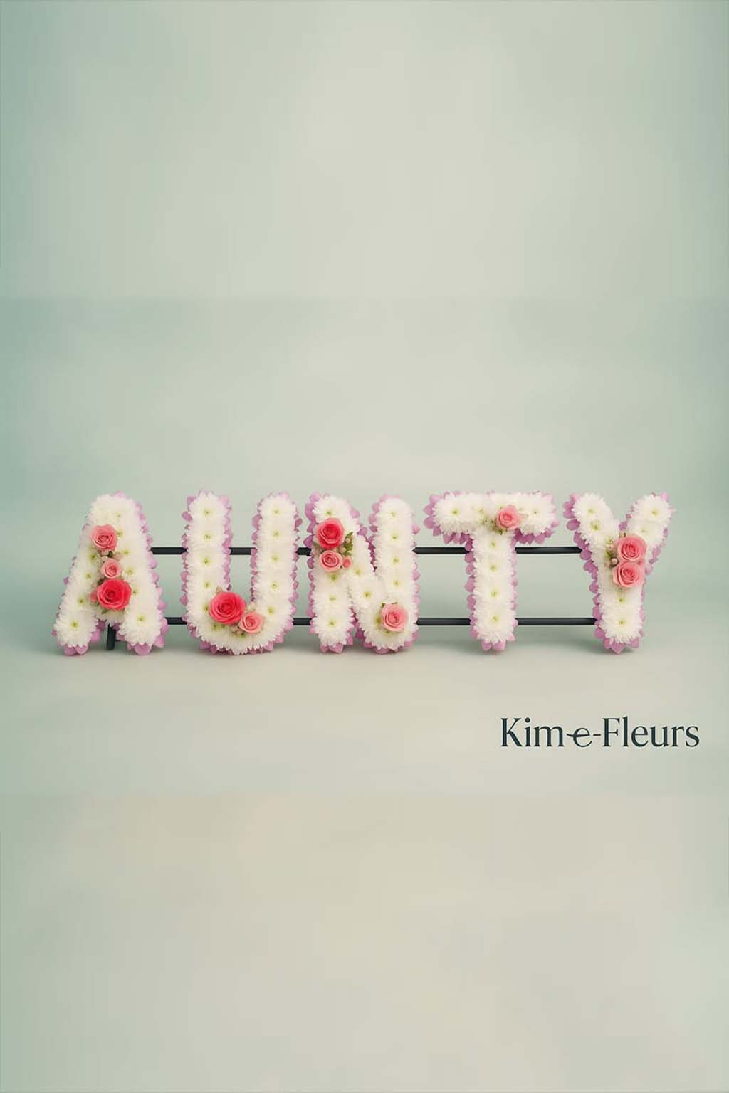 Our AUNTY Funeral Letter Tribute is a touching way to honour a cherished aunty’s memory. This floral arrangement spells out “AUNTY” in elegant, fresh blooms, lovingly handcrafted in your chosen colour theme.