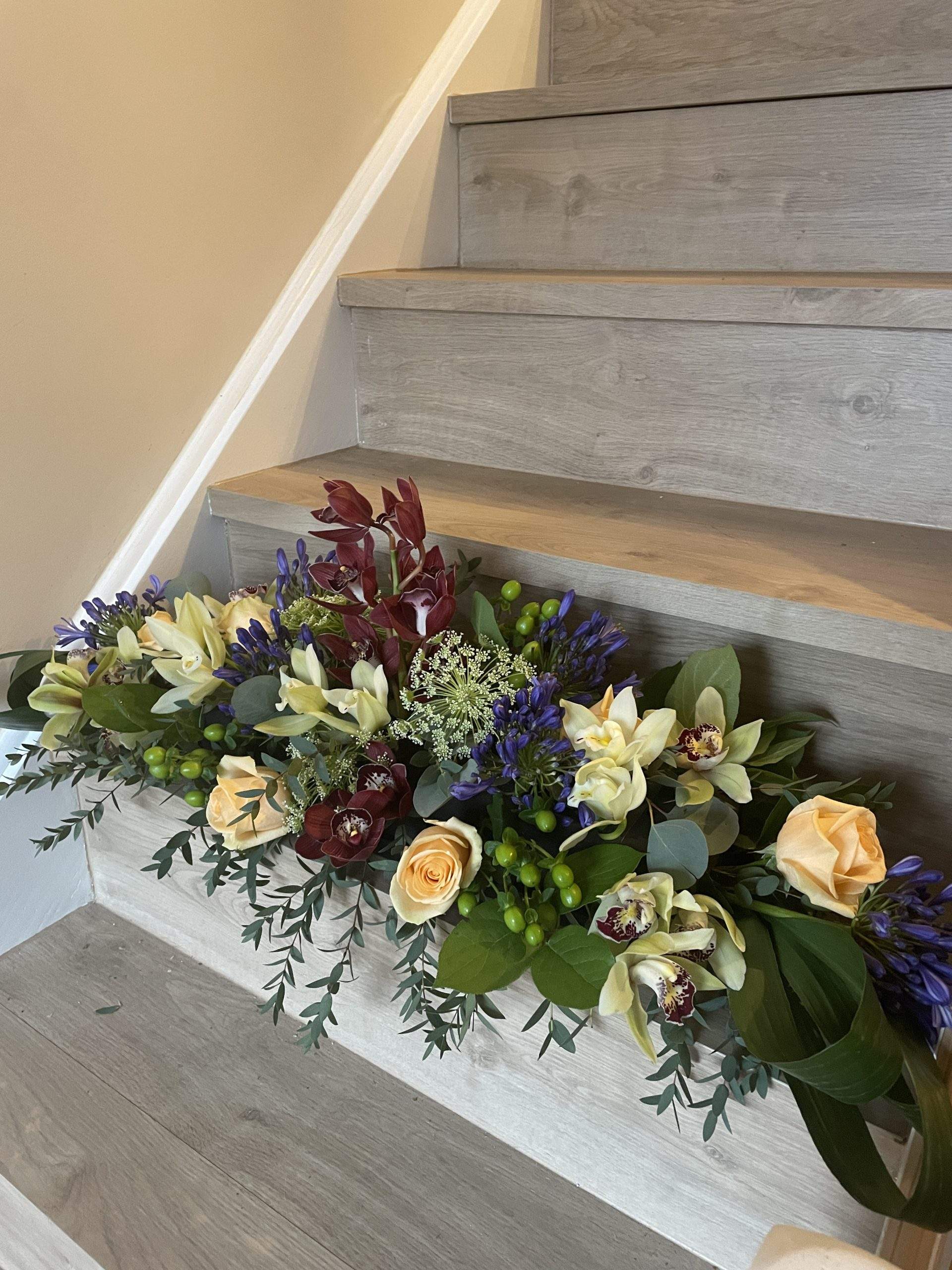 This display is a testament to the timeless beauty of orchids and roses