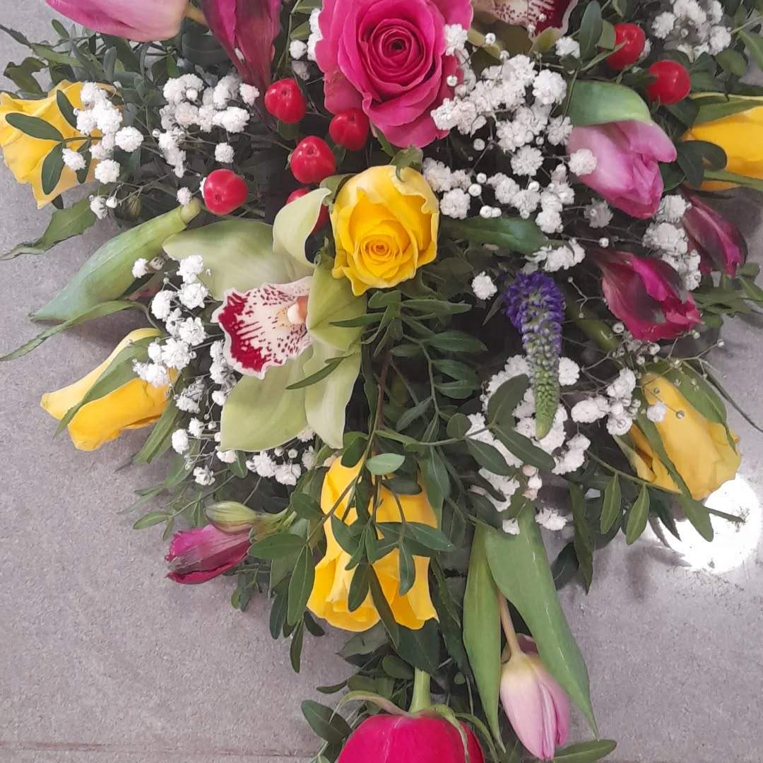 and elegant florals, this heartfelt display offers comfort, love, and a timeless farewell